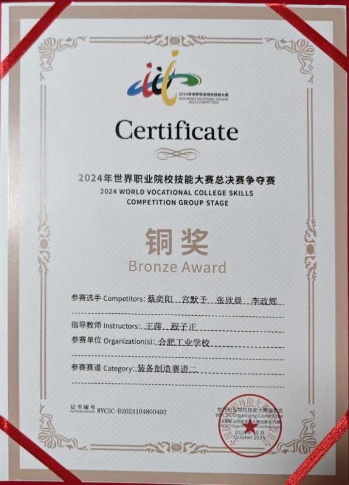 张欣晨获得2024年世界职业院校技能大赛总决赛争夺赛铜奖。淮南师范学院供图